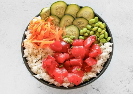 Sushi rice topped with tuna, cucumber, avocado, radish, carrot, edamame, green onion and sesame seeds.